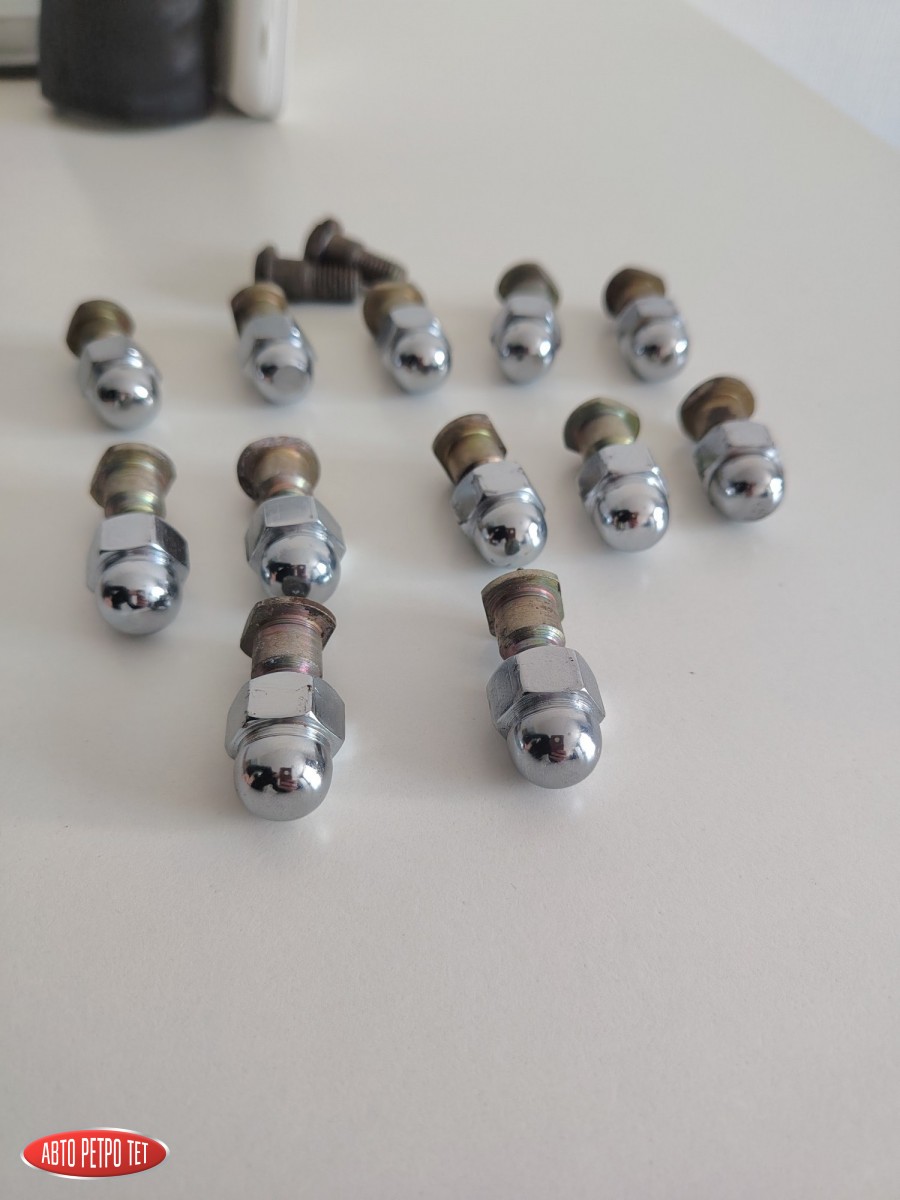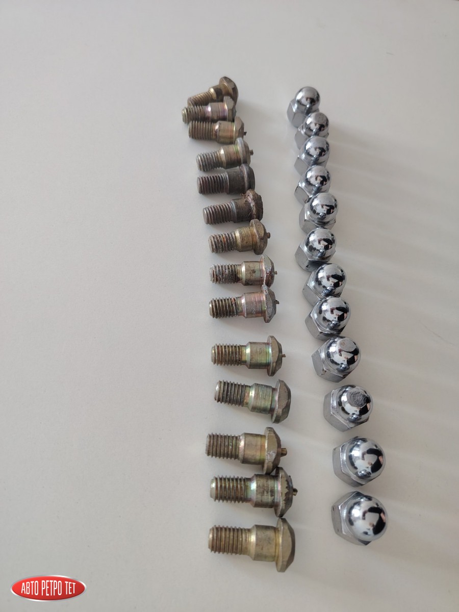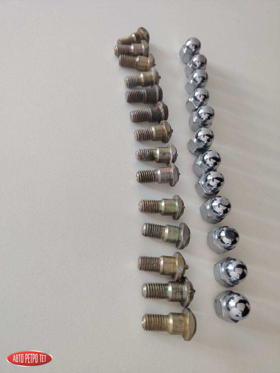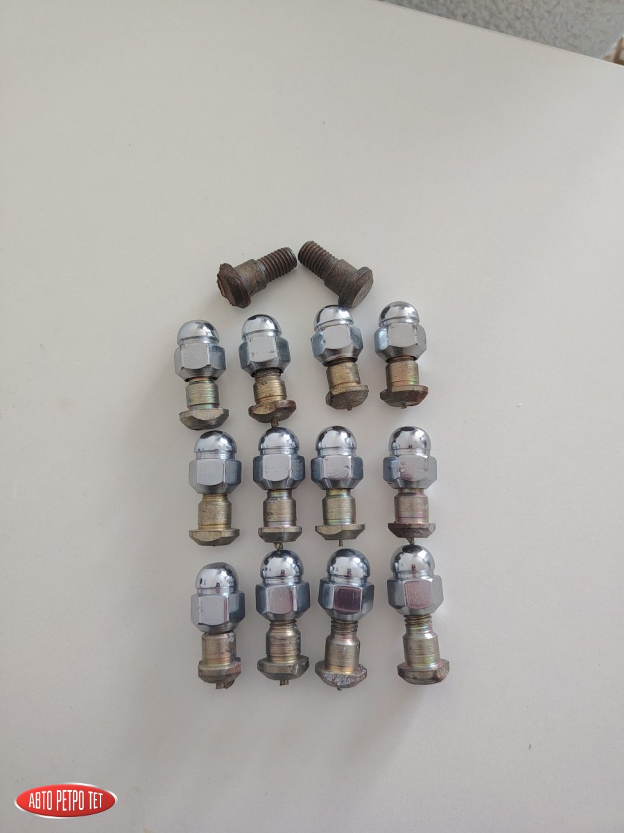 Оригинальные хромированные гайки и шпильки на Запорожец: 12 гаек, 14 шпилек. Комплект был установлен на новые барабаны в консервации. На некоторых гайках есть микроследы от ключа при откручивании; при установке на машине не видно. Стоимость за всё вместе со шпильками.